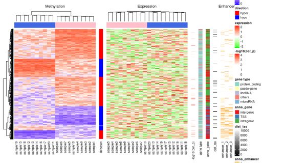 本次,我們將展示一個甲基化與表達譜聯(lián)合分析的熱圖。本著先學(xué)習(xí)再創(chuàng)造的態(tài)度,小編做了一下知識的搬運工,本篇所有代碼均引用自:Zuguang Gu, Roland Eils and Matthias Schlesner,?Complex heatmaps reveal patterns and correlations in multidimensional genomic data,?Bioinformatics, 2016。