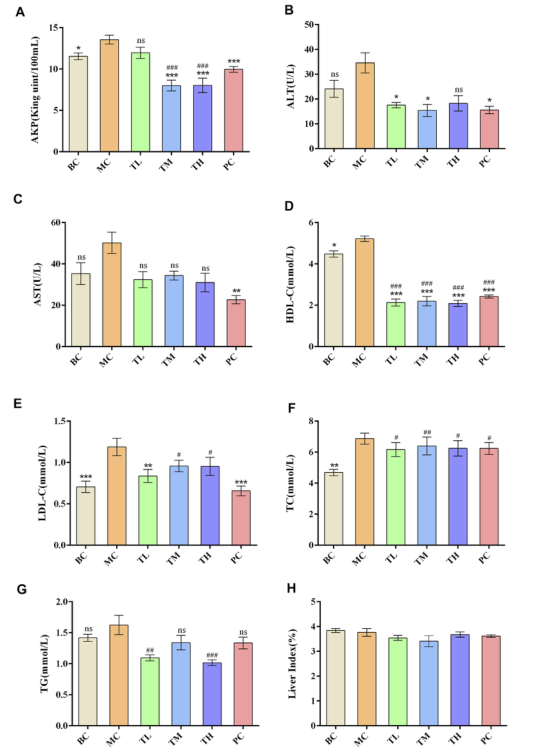 TM組和TH組降低AKP效果優(yōu)于TL組,TG組降低AKP效果優(yōu)于TM組。PC組降低AKP的效果優(yōu)于TL組,但差于TM組和TH組。PC組降低低密度脂蛋白膽固醇的效果優(yōu)于TM組和TH組,表明高脂飼料可導致大鼠血脂和肝酶代謝異常,高脂高脂顆??筛纳聘咧笫笱x和肝酶活性。與陽性藥物相比,HRG在改善高密度脂蛋白膽固醇、甘油三酯、堿性磷酸酶方面具有優(yōu)勢,且改善程度可能呈劑量依賴性。各組間器官指數(shù)無顯著差異,HRG對小鼠生化指標和器官指數(shù)的影響如圖2所示。