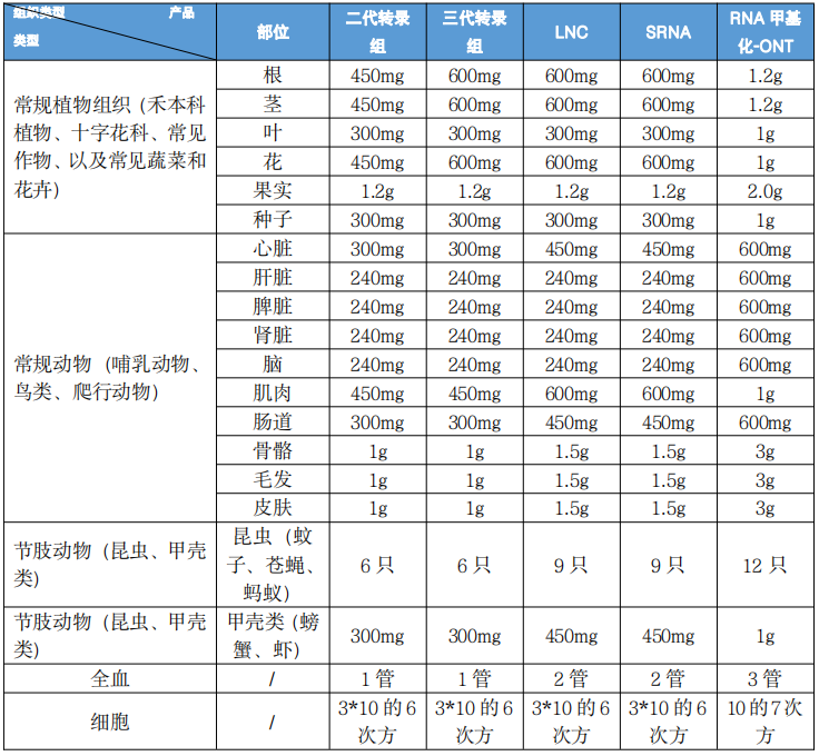 2) 組織送樣量:建議送樣量適用于 95%的物種組織,少部分組織因胞內核酸量較低,需適當增加送樣量,比如動物皮膚、毛發,植物果實、根等。請嚴格按照上方組織送樣量要求送樣,送樣量過少或過多均不利于提取實驗。采樣量較少會導致提取的 RNA 總量、濃度不合格,采樣量過多反而會造成速凍不徹底、提取取樣困難、凍融降解等危險。