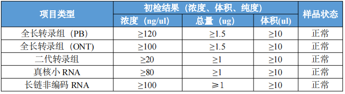 2、以上均是單個文庫的總量要求,如果樣品做多個文庫按(小 RNA>LNCRNA>轉錄組 RNA)判。總量不足的文庫有樣品判 C 不通過,無不合格原因,根據二次提取的總量判定。無樣品根據剩余總量判判定下一文庫。