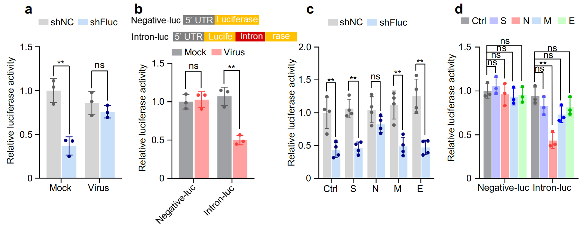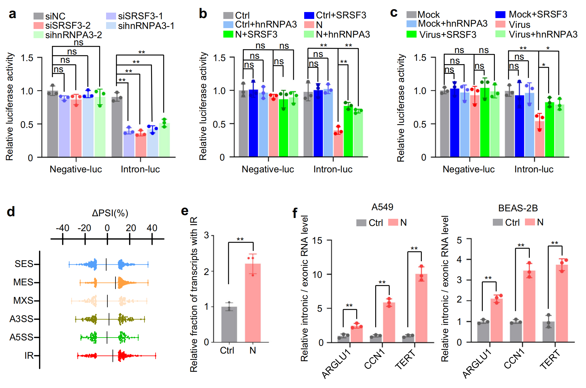 SRSF3hnRNPA3敲除抑制了含有內含子的報告基因小基因的剪接,證實了它們確實是剪接因子,而它們的過表達部分緩解了 N 蛋白或 SARS-CoV-2 感染對 RNA 剪接的抑制作用,進一步進行全長轉錄組測序,通過可變剪接分析發現,N 蛋白誘導內含子保留。此外,RT-qPCR證實,異位 N 蛋白表達或 SARS-CoV-2 感染降低了一組內源性內含子的剪接效率,SRSF3?和?hnRNPA3?過表達部分減輕了 N 蛋白和 SARS-CoV-2 對 RNA 剪接的抑制作用,這些結果表明,N 蛋白通過降低?SRSF3?和?hnRNPA3?的表達來抑制 RNA 剪接。