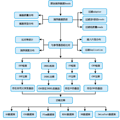 全基因組重測序(whole genome sequencing,WGS)對全基因組進行測序掃描,能在全基因組范圍之內解讀所有常見和稀有變異信息,全面檢測單核苷酸多態位點(Single Nucleotide Polymorphisms, SNP)、插入缺失位點(Insertion Deletion, InDel)、結構變異(Structure Variation,SV)以及拷貝數變異(Copy Number Variation, CNV)。