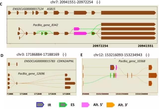 PacBio鑒定到多達24,797個AS事件,并對這些可變剪接進行分類統計(Table 1),在兔的參考基因組中僅發現2,398個AS事件,將數據合并后共得到34,173個AS事件,且可變剪接事件包含不同的4中類型,另外,鑒定到11,184個APA事件。挑選5個基因,并用圖表示出不同的isoform比對到參考基因模型上(Figure 2)。