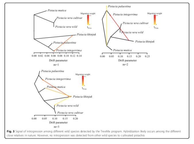 為了研究開心果的種群歷史和適應性進化,研究者對107個開心果基因組進行重測序,包括93個品種和14個野生開心果,平均測序深度為6-8X。作者還重新測序了來自不同近緣種的35個基因組,包括P.mutica,P.khinjuk,P.integerrima和P. palaestina。用stringent GATK pipeline,發(fā)現(xiàn)14.77百萬個單基因變異位點,其中2.42百萬個在基因區(qū)。使用鄰近法和最大似然法的系統(tǒng)發(fā)育分析清楚地分離了5種不同的種群,即?P.vera, P.mutica, P. khinjuk, P. integerrima, and P. palaestina。通過TreeMix程序在一些物種之間檢測到漸滲的信號,這表明雜交可能在自然界中的不同近親之間發(fā)生,并且與植物中被發(fā)現(xiàn)的普遍雜交一致。然而,從其他開心果物種到馴化的開心果沒有檢測到漸滲,這種現(xiàn)象來源于野生的P. vera(圖3)。