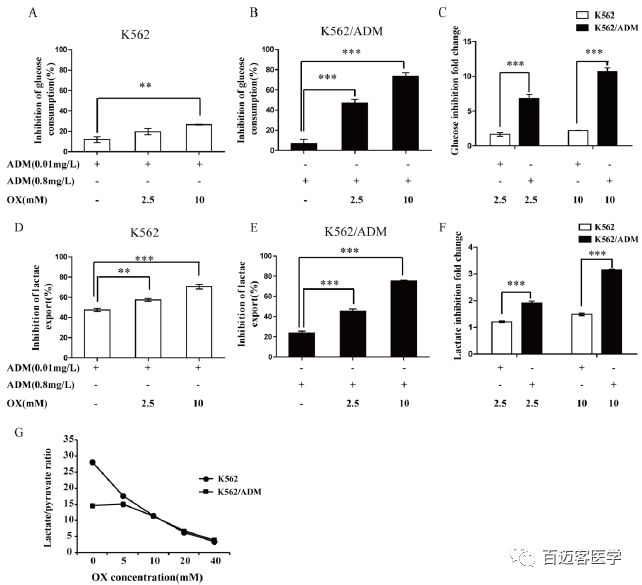 在上述試驗中,作者發現ADM聯合草酸處理增加了人白血病細胞的細胞毒性。然后,作者研究了草酸對ADM處理的K562和K562/ADM細胞系糖代謝作用的影響,發現相比于ADM單獨處理,ADM和草酸共同處理48h后,兩個細胞系的葡萄糖消耗和乳酸生成的抑制作用均有所增強。草酸導致兩種細胞系糖酵解抑制呈現劑量依賴性增加,而耐藥細胞糖酵解抑制的變化倍數更高,這與聯合處理時耐藥細胞療效升高倍數更高所一致,說明草酸對糖酵解的抑制導致葡萄糖消耗和乳酸生成的減少,導致白血病細胞對ADM的敏感性增加。