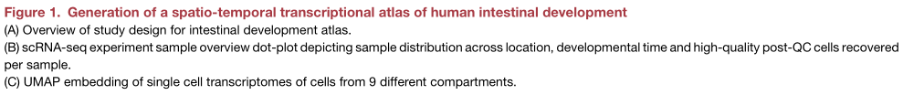 研究人員從代表了不同的發(fā)育時(shí)間和組織位置的17個(gè)單獨(dú)的胚胎中收集了77個(gè)腸道樣本繪制成單細(xì)胞圖譜 (Figures 1?A和1B),數(shù)據(jù)集范圍從8到22 PCW,跨越隱窩形成之前的時(shí)間點(diǎn),直至成人狀絨毛/隱窩形態(tài)的發(fā)展(FiguresS1A)。使用寡核苷酸標(biāo)記抗體,產(chǎn)生了76,592個(gè)細(xì)胞 (Figures 1A 和 S1B–S1I; STAR methods)。