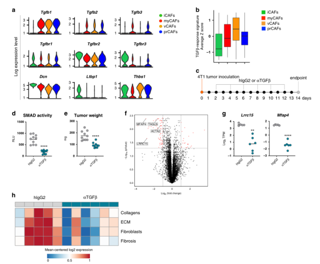 綜上所述,這些數據促使我們研究TGFβ-阻斷劑在體內對CAF表型和功能的相對影響。為此,6周齡雌性小鼠接種4T1腫瘤細胞,隨后用TGFβ阻斷抗體或同型對照處理,研究設計如圖2c所示。結果表明這種腫瘤進展的延遲似乎不是由抗TGFβ對腫瘤細胞的直接作用引起的,更可能是TGFβ阻斷后微環境變化的結果。事實上,使用TGFβ中和抗體可導致整體基因表達的顯著差異,這在對大量冷凍腫瘤RNAseq分析中得到證實(圖2f)。與這些發現一致的是,我們通過分析與膠原沉積和纖維化相關的基因特征,描述了抗tgfβ治療小鼠腫瘤中整體促纖維化程序的顯著減少(圖2h)。綜上所述,這些數據表明靶向TGFβ影響了腫瘤微環境中的成纖維細胞動力學。