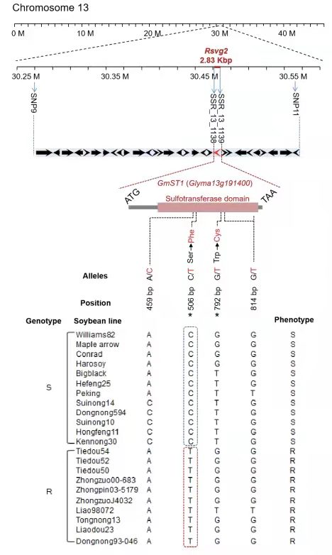 大豆[Glycine max(L.)Merr。]是一種在世界范圍內種植的重要油料作物,是人類豐富的植物油和蛋白質來源。但許多病原體優先攻擊大豆。這些攻擊導致嚴重的產量損失和質量下降。在全世界攻擊大豆的病原體中,大豆花葉病毒(SMV)是通過蚜蟲和感染的種子非持久性傳播的,是最廣泛和破壞性最大的疾病之一。SMV感染通常會使大豆產量降低10–30%,但在嚴重暴發時,損失可能達到50–100%。根據大豆品種中SMV感染的癥狀,包括典型的葉片圖案,葉片變形,植物發育不良,頂部壞死和種子斑點,將SMV菌株分為7種主要致病型:G1-G7。由于種子的可傳播性,所有主要大豆生產國都存在菌株致病型(G1-G7)。目前,有4個主要的SMV抗性基因座(Rsv1,Rsv3,Rsv4和Rsv5),大豆基因組的可用性加快了分子標記的開發和Rsv基因座候選基因的鑒定。最主要的Rsv1基因座是最復雜的,它包含編碼NBS-LRR蛋白的基因簇,這個染色體區域還攜帶多種病原體抗性基因,一大類同源NBS-LRR序列聚集在Rsv1基因座上,據推測,DNA的兩個片段分別是3gG2(Glyma.13g190800的等位基因)和5gG3(Glyma.13g190000的等位基因),是Rsv1的最可能的候選基因,針對Rsv3,Rsv4也進行了相關的研究。盡管針對每個Rsv基因座篩選了候選基因,但除了Rsv4以外,沒有一個關鍵基因被完全闡明。本研究中使用重組自交系RIL群體和F2分離群體,確定并精細繪制了SMV抗性基因座Rsvg2;分離候選基因的同時,使用表達分析和遺傳轉化測定法驗證了其功能。最終發現,Rsvg2編碼磺基轉移酶(SOT),GmST1,與AtSOT15(AT5G07010)同源,為大豆對SMV的抗性提供了新的可能解釋。