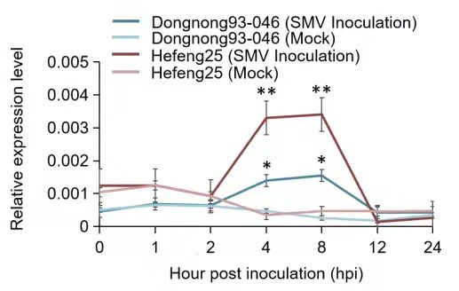 圖2 GmST1基因在抗SMV的Dongon93-046和SMV感的Hefeng25中的相對表達