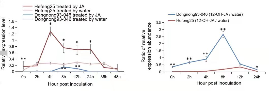 研究中為了證明在RSVG2-S等位基因和RSVG2-R等位基因之間,GmST1對SMV應答的功能機制有所不同,且可能與JA信號通路相關(圖4),進一步關注了RSVG2-R等位基因攜帶者(Dongnong93-046與轉基因株系OE2-18)和RSVG2-S等位基因載體(Hefeng25)JA含量的轉錄本的變化,結果表明,內源性JA對SMV G2菌株有響應,且響應程度在GmST1的不同單倍型之間發生變化。最后基于RNA-seq數據,通過轉基因與非轉基因植株的比對,對JA信號通路相關基因進行研究,結果表明,在SMV G2菌株感染下,JA的合成和代謝在RSVG2-R等位基因攜帶者中比在RSVG2-S等位基因攜帶者中更活躍,作為JA信號傳導途徑中的受體蛋白編碼基因,JAZ在具有不同GmST1等位基因的大豆品系之間具有差異表達,說明JA途徑是由SMV感染誘導的,且GmST1介導的SMV抗性可能取決于JA防御反應。
