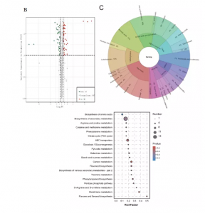 共鑒定到36個上調代謝物和47個下調代謝產物(圖4B),包括類黃酮,碳水化合物、氨基酸和衍生物等(圖4C)。KEGG富集分析表明差異代謝物(DAMs)主要在氨基酸生物合成、次生代謝產物生物合成、C代謝和類黃酮生物合成富集。碳水化合物中D-果糖6-磷酸和Dglucono-1,5-內酯的下調倍數最大,氨基酸和衍生物中,有四種下調,六種上調,其中高精氨酸的上調倍數最大。此外,結果還表明果實中積累的黃酮類化合物較少,且氮含量較高,尤其是鼠李素-3-O-蘆丁苷和蘆丁。