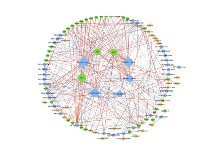 基于Pearson相關分析(系數>0.9,P<0.05),篩選與初級代謝和次級代謝相關的基因、蛋白質和代謝物(圖7)。獲得5個hub基因和3個hub蛋白,其中MD07G1172700(編碼PAL)包含在次級代謝中,MD05G1222800(編碼argD)、MD16G1227200(編碼leuC)、MD01G1174400(編碼GLUD1_2)、MD02G1207200(編碼tktA)、PFK、gapN,而HK則包含在初級代謝中。這些hub基因和蛋白質之間存在著相對較多的正相關節點。