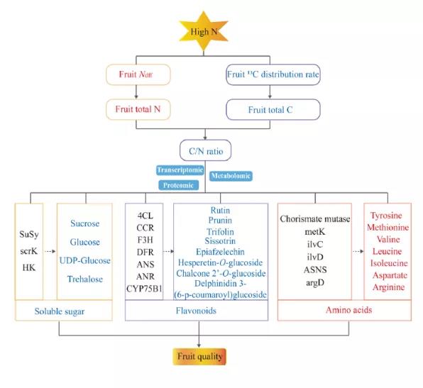 高氮增加了果實對15N的吸收和調節能力,降低了C在果實中的分配率,從而導致蘋果果實的總N增加,總C和C/N比率降低。高氮破壞了蘋果C?N平衡,降低了蘋果果實的可溶性糖和總黃酮含量,進而使果實品質惡化。基于多組學分析,揭示了高氮對初級代謝和次級代謝互作網絡。高氮調節了蘋果果實中基因和蛋白質的表達,抑制了碳水化合物和黃酮類化合物的積累,更多的碳骨架被用來合成氨基酸及其衍生物并轉移到氮代謝中。本研究揭示了高氮導致蘋果果實糖和類黃酮含量下降的機理,并獲得了關鍵候選基因和蛋白質。