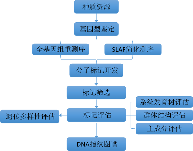目前常用的SNP檢測與分型的方法主要有全基因組重測序、簡化基因組重測序和基因芯片技術(shù)三種。通過這些方法開發(fā)的SNP經(jīng)過變異檢測、注釋和篩選后,得到質(zhì)量高、代表性強(qiáng)、標(biāo)記(組合)的材料區(qū)分度高、在基因組上分布均勻、特異性強(qiáng)的SNP標(biāo)記作為DNA指紋圖譜的候選標(biāo)記。