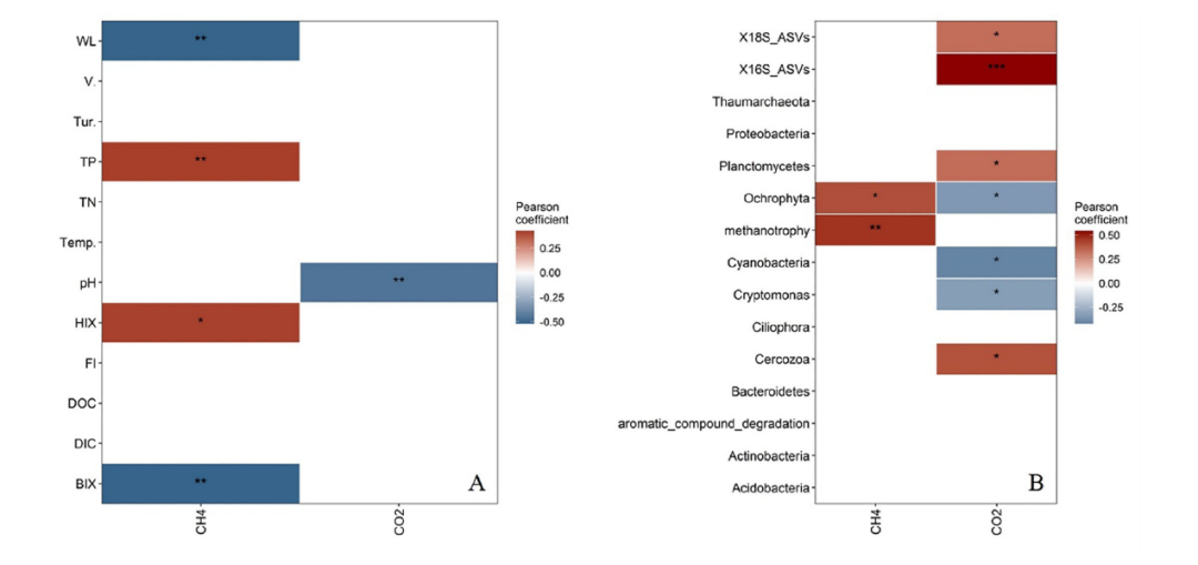 圖3生理化學變量和微生物與TGR中CO2和CH4通量之間的相關性,A組和B組分別為生理化學變量和微生物