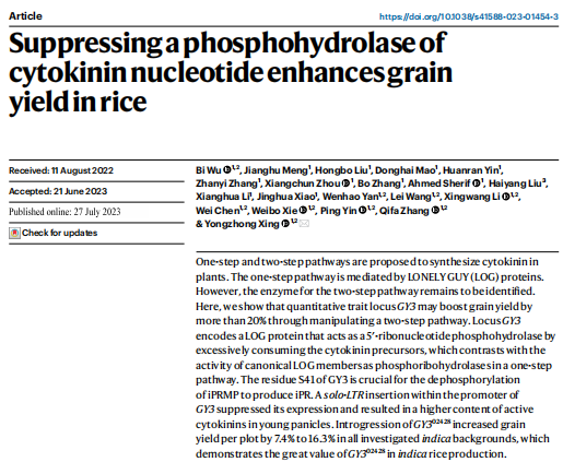 作者通過秈稻品種特青和粳稻品種02428構建高級遺傳群體克隆了產量相關基因GY3,其啟動子區域的反轉座子插入增強了啟動子區域的表觀修飾,降低GY3表達量,從而減少細胞分裂素合成前體底物的無效消耗,提高體內活性的細胞分裂素含量,增加每穗粒數和谷物產量。GY3可作為后期秈稻高產育種的重要目標基因,推動產量提升。