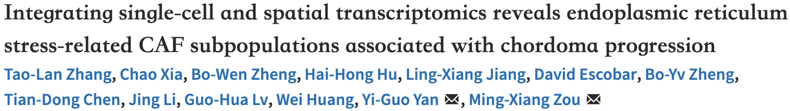 文章標題:Integrating single-cell and spatial transcriptomics reveals endoplasmic reticulumstress-related CAF subpopulations associated with chordoma progression