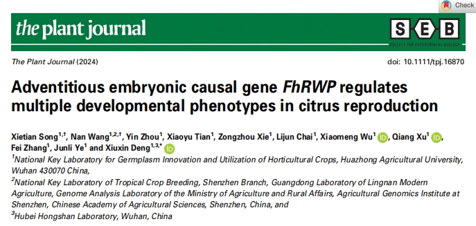 Song X, Wang N, Zhou Y, Tian X, Xie Z, Chai L, Wu X, Xu Q, Zhang F, Ye J, Deng X. Adventitious embryonic causal gene FhRWP regulates multiple developmental phenotypes in citrus reproduction. Plant J. 2024 Aug;119(3):1494-1507. doi: 10.1111/tpj.16870. Epub 2024 Jun 16.