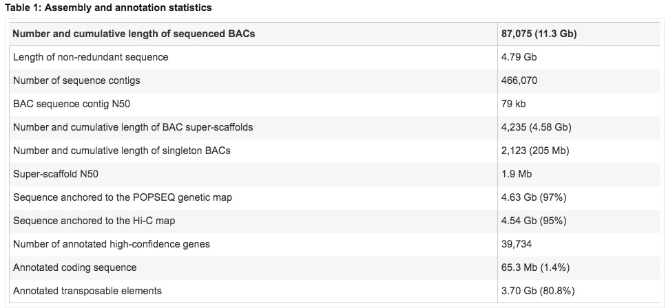 到底是什么解救了大麥基因組?廢話不多說,看看人家的組裝結果(表1)。